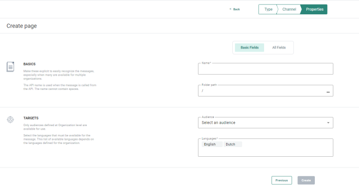 - Languages — Select one or more Languages. The list of available languages depends on the Business unit for which the page is created. The Language field is pre-filled with the default languages defined at Business unit level. For each of the selected languages you will be able to create a version of the page.