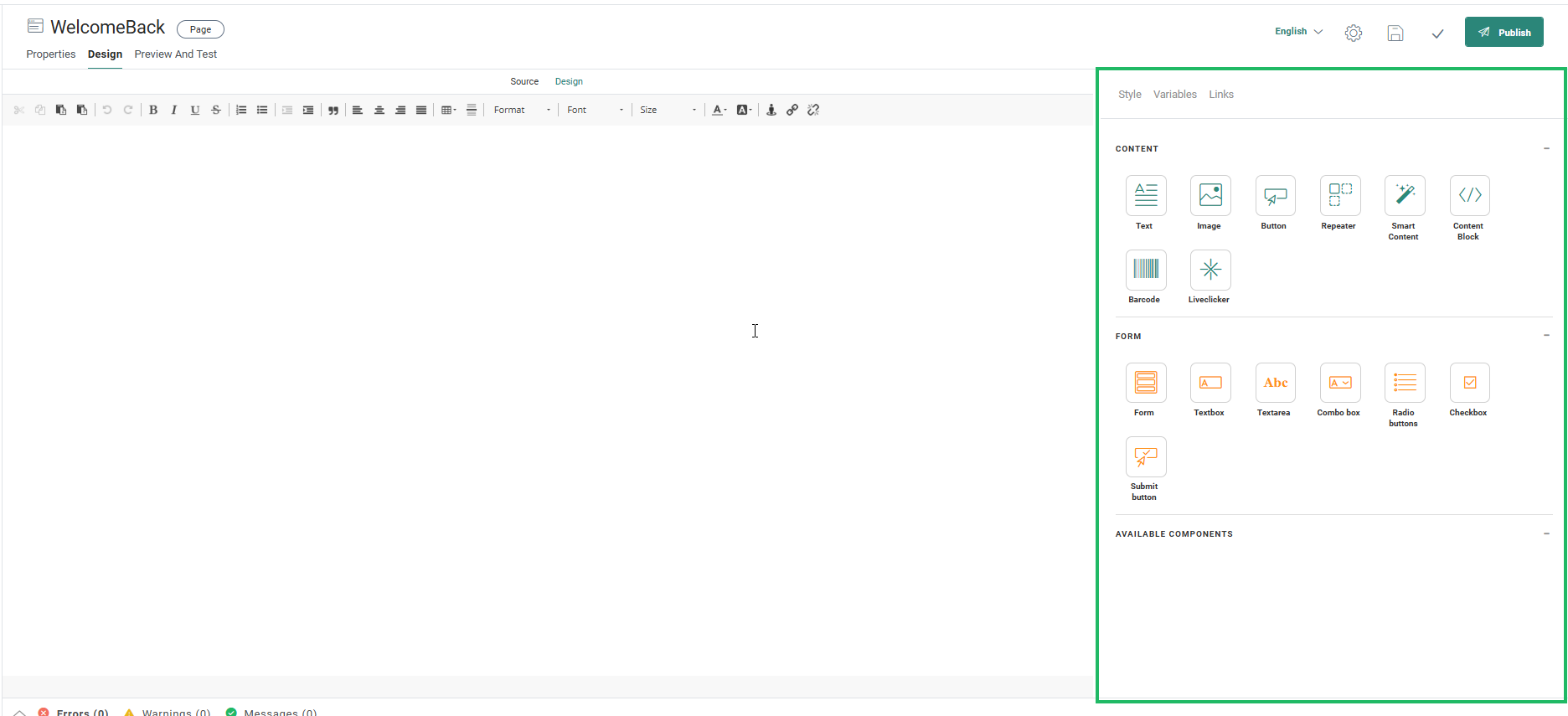 By using these components, Selligent specific SG tags are used in the source giving you access to the properties panel for each one of the components. As a result, different content can be created for the different languages.