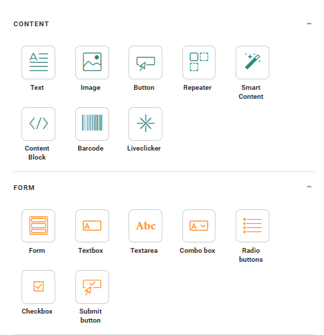 On the right side of the window, a component panel is displayed containing all possible content components that can be placed in the page. (For more details on these components check this topic.) It has the following toolbar: