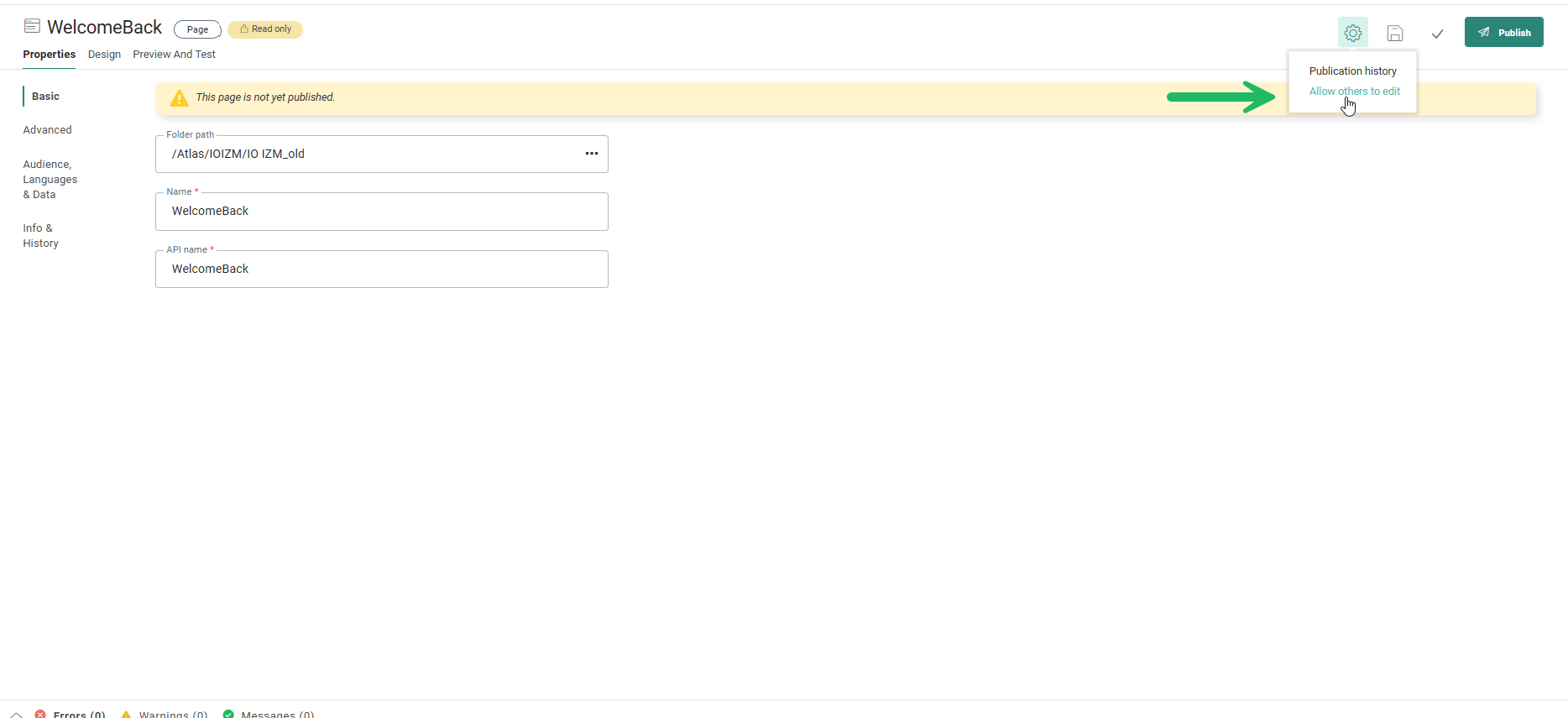 - Preview and Test — Gives access to the page preview.