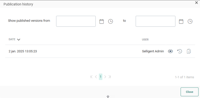 The Publication history option in the actions drop-down menu button provides a historical overview of when the page was published. You can filter the list by providing a start and end date.