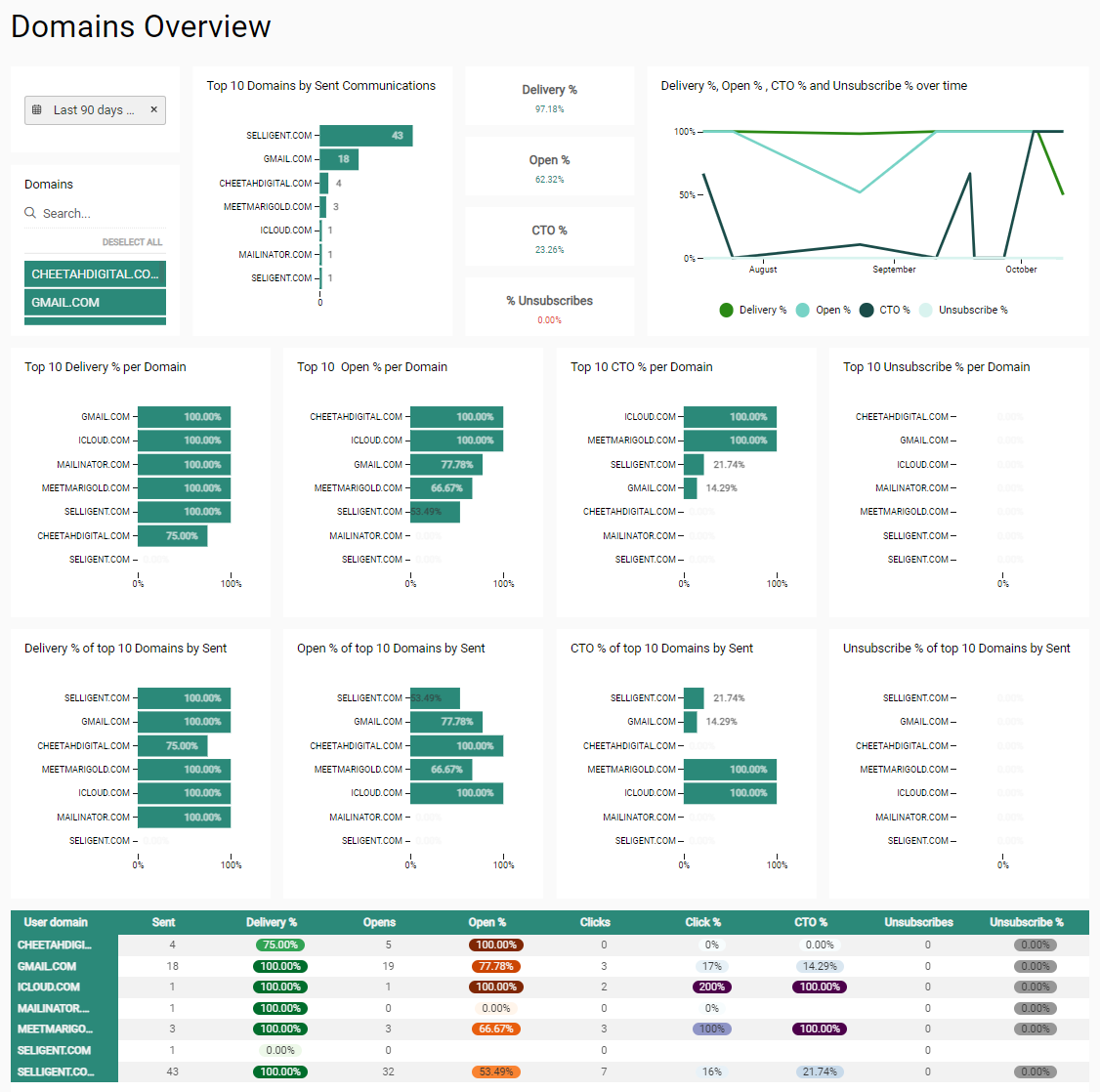 - CTO % — Percentage of opened communications that have been clicked for the selected domain (or for all domains when no domain is selected).