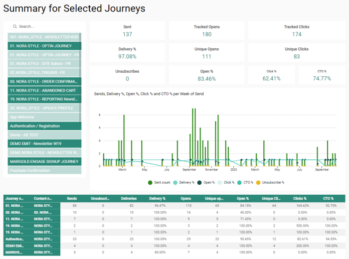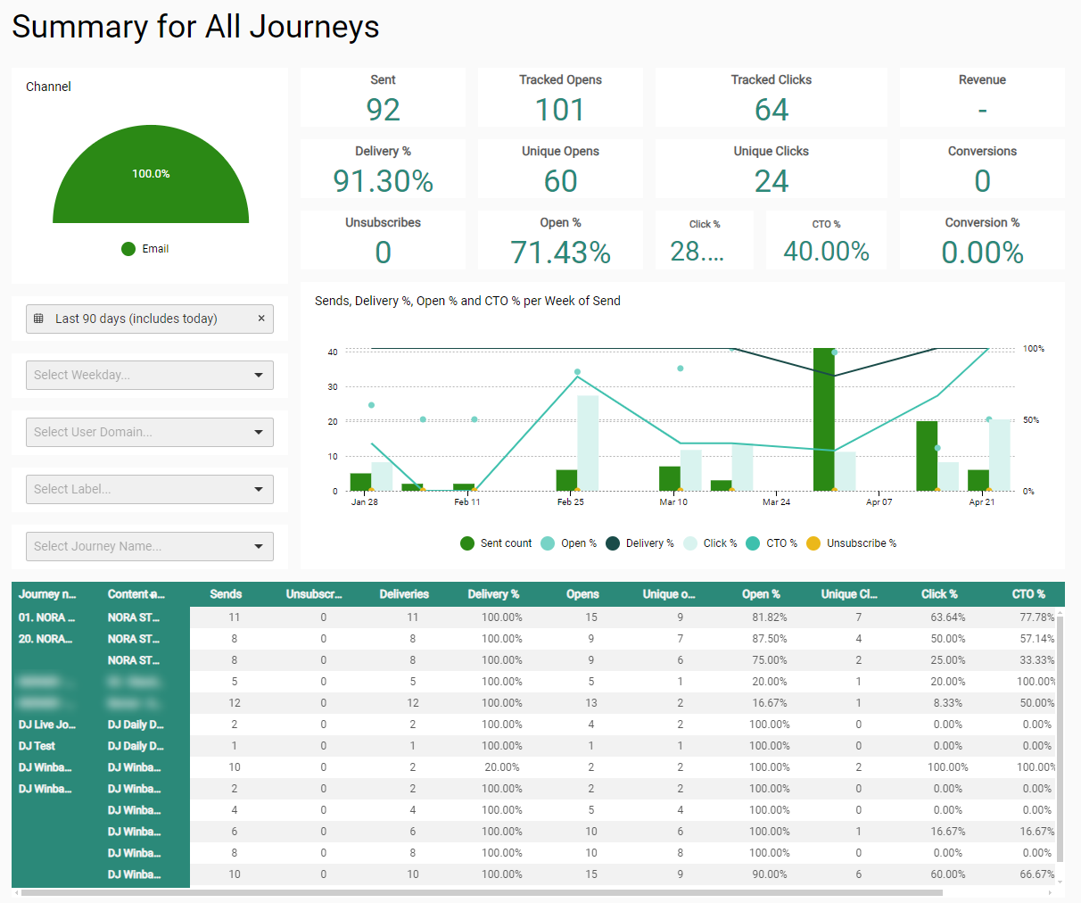 - Summary for Selected Journeys — Multi-channel performance metrics for selected journeys over time, per executed day of week and per domain
