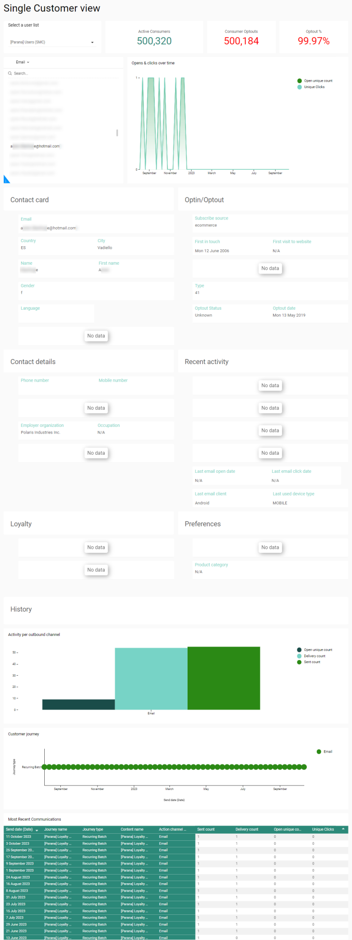 - Single Customer View — Dashboard showing omni-channel details of a specific contact in a selected Audience List. This includes general information on the contact, opt-in/opt-out details, preferences, historical interactions, etc.