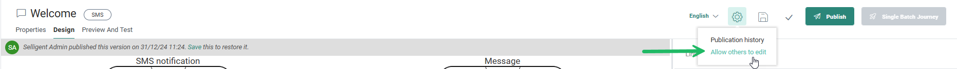 The Save, Validate, Publish buttons are only available in Edit mode. The SMS message can be saved at any time during the design. Validation checks the SMS for missing information and Publish makes the SMS text message available for use in Selligent journeys.