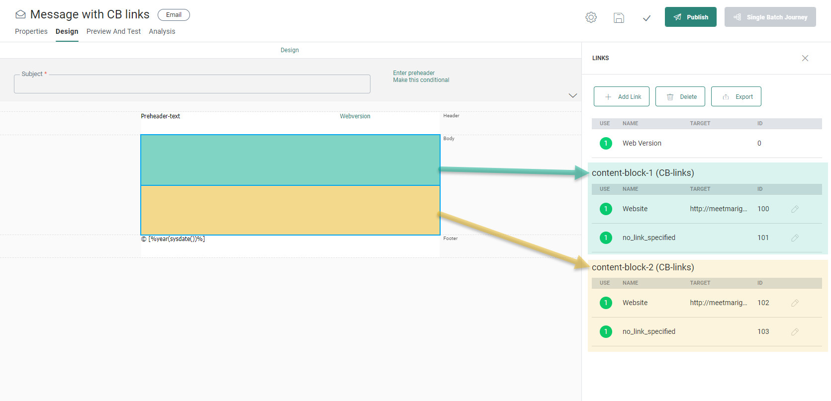 1. The first link contains the reference and a data-link attribute. This one will be tracked and will be visible from the Links tab. The reference cannot be modified once the Content Block is used in a message.
