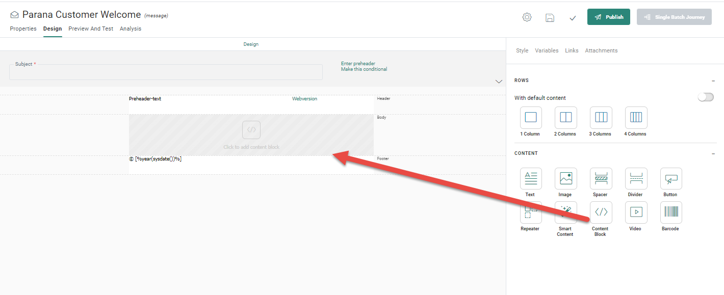 When the Content Block added to the template contains one or more variables, these variables are automatically added to the template. Variables can be used in the Content Block for personalization or in visibility constraints.