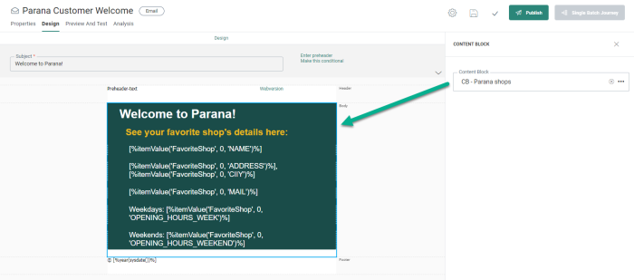 Content in a Content Block can be made dependent on a variable. Variables are used in templates, giving a level of flexibility when this template is used in a journey. You can then fill out this variable and influence the final look and feel of the content.