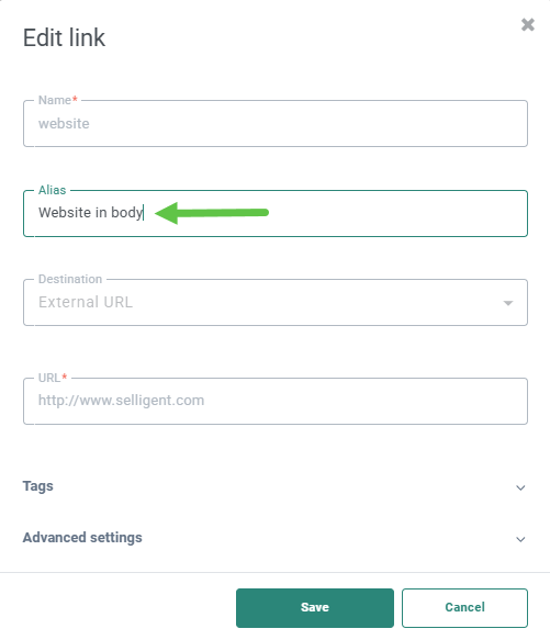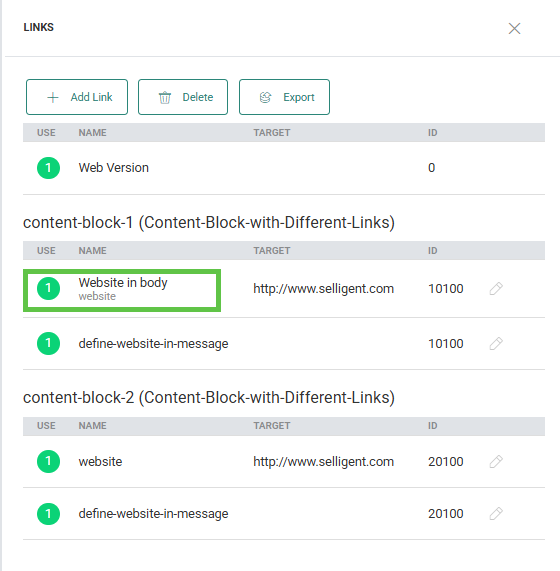 Note that the pencil icon allows you to edit the link and provide an alias. This comes in handy when the same Content Block is used multiple times and the links are listed multiple times. Reports on these links will take the alias into account.