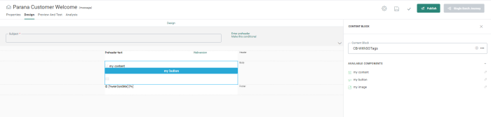 3. When selected, the placeholder in the message is filled out with the HTML code of the Content Block giving insight on what the actual content will be. This design view is available in Responsive and WYSIWYG mode.