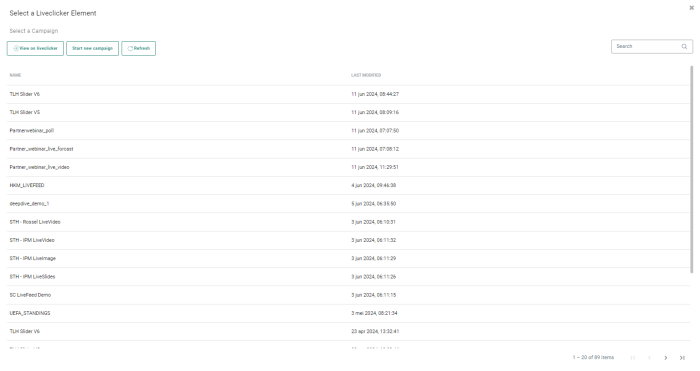 3. From the displayed list of campaigns on the left, select the desired Liveclicker campaign. On the right hand side, all elements in the selected campaign are shown.