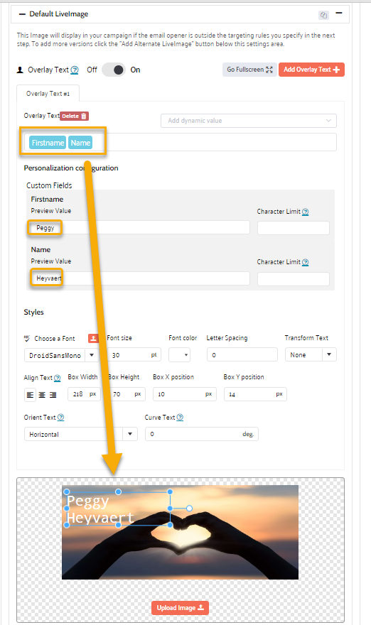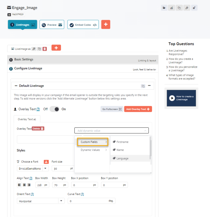 2. In your Liveclicker campaign, add an overlay text for the birthday image using custom fields. In the Overlay text configuration, select 'Add custom fields' from the drop-down field:![]()