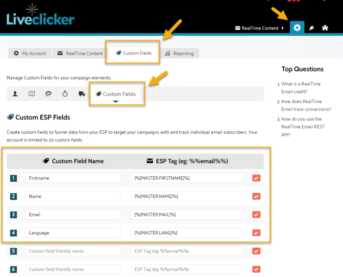 1. In the settings of your Liveclicker environment, define the custom fields you want to use. In this example, we defined first name, name, email and language as custom fields. It is important to use the correct Selligent syntax for the mapping between the custom field in Liveclicker and the personalization field in Selligent.![]()