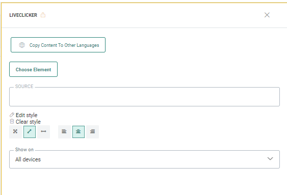 Technical note: You can also add the Liveclicker component directly in the source, using the following SG tag: <sg:livecontent id="ID_OF_LIVECONTENT" />