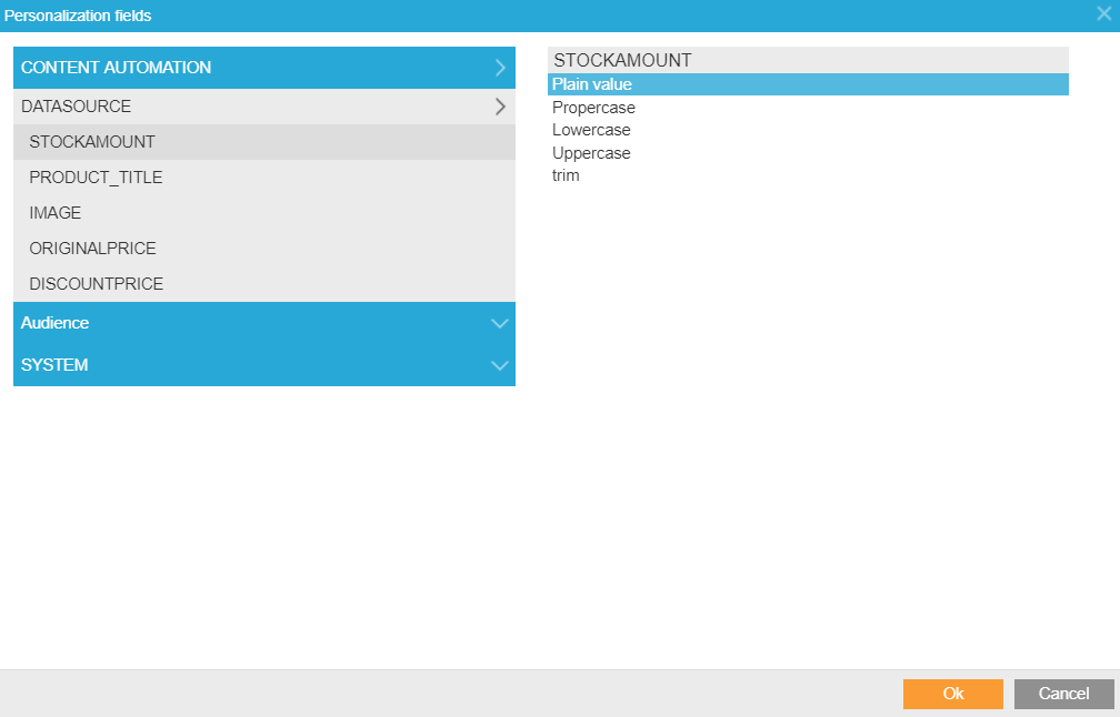 When clicking a field on the left, a personalization icon gives access to fields in the audience or data source: