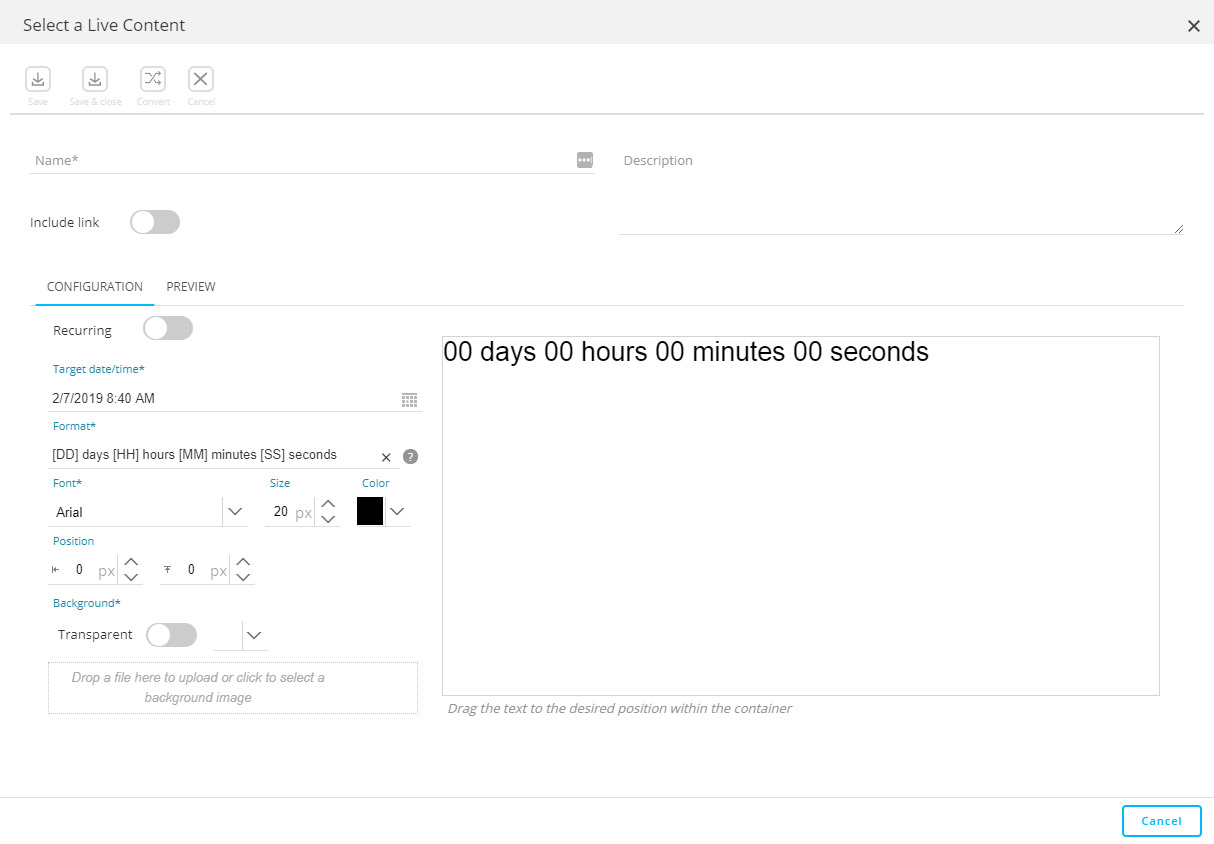 - Position — Define the left and top padding values in pixels to generate space around the countdown timer.