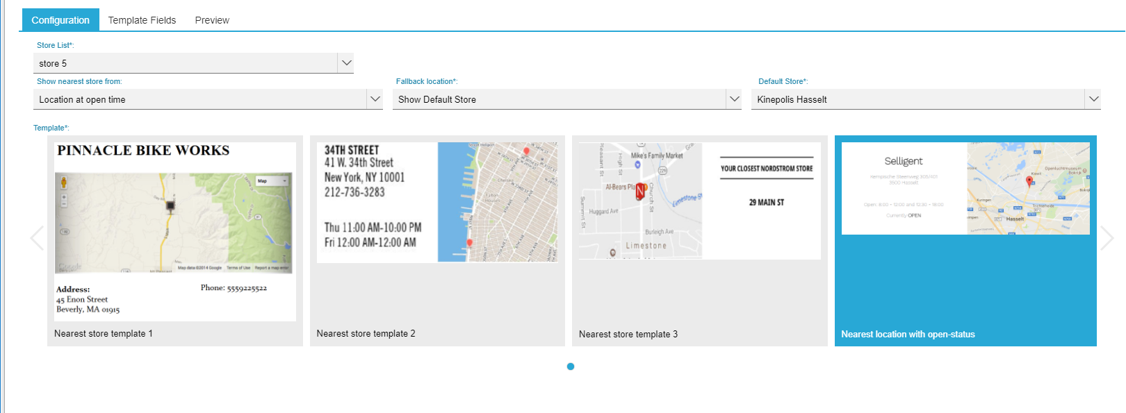 Store list — This list contains all the stores and the store information (The list is imported into Selligent). If there is only one list, it is automatically selected. If there are more lists, a drop down is available.