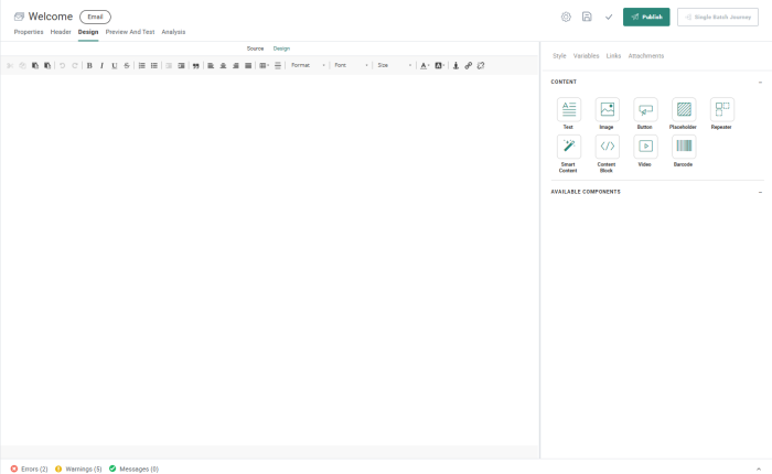 When creating new content from a Blank message, a new message is created, completely from scratch, without any layout or predefined structure (Contrary to a message created in Responsive Design, where a pre-defined header, body and footer are already present). The user has the choice to work in Source mode (entering the HTML manually) or in WYSIWYG (Design) mode (using the drag and drop interface) and toggle between both views. The following page is displayed.