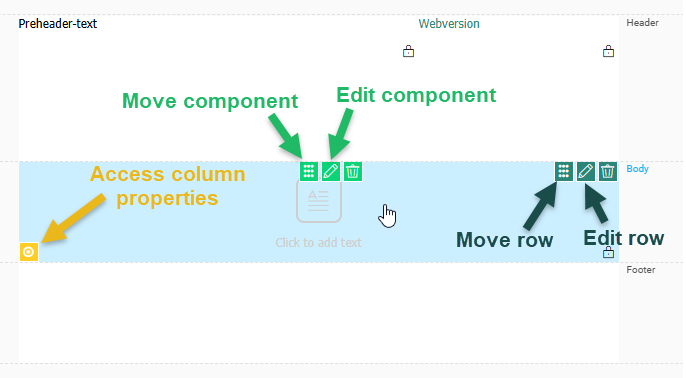 To access the properties of rows, columns and components, a color code is used for the different icons in the design. The icons pop up when hovering the element. When clicked, it gives access to the options for corresponding element: