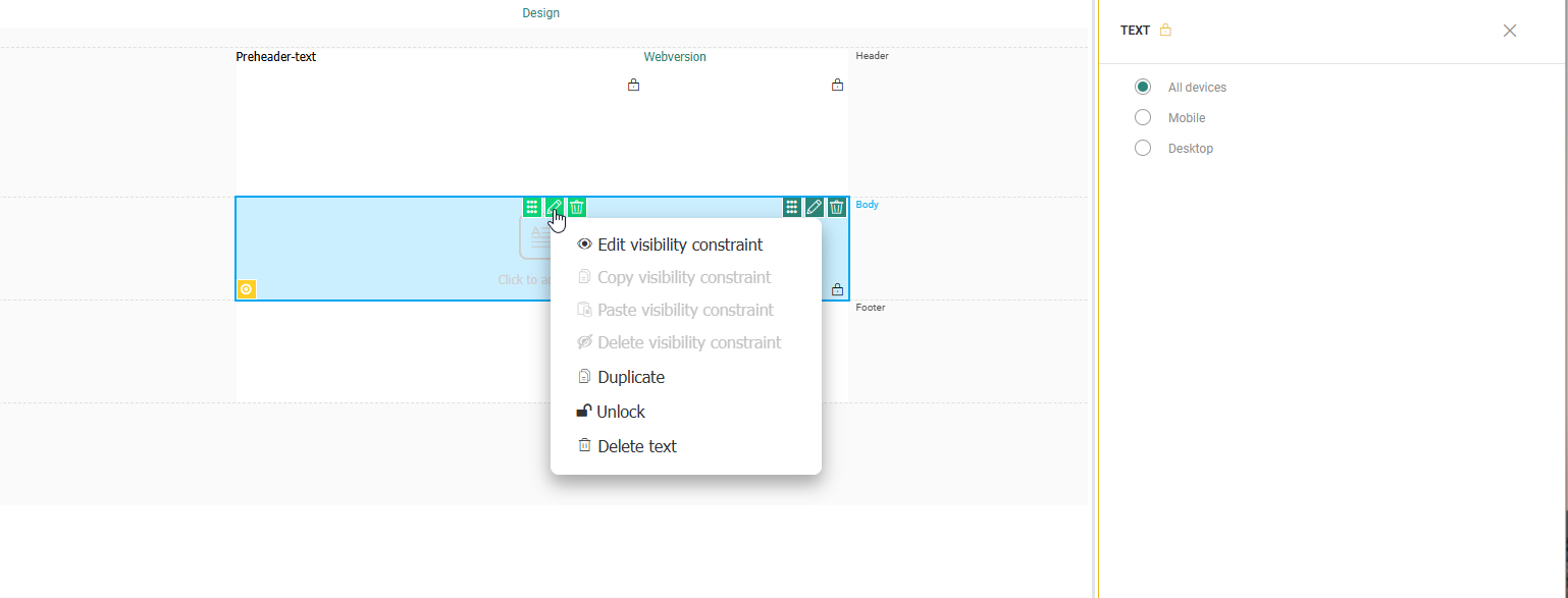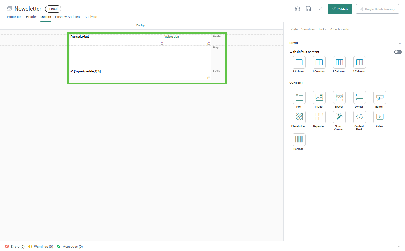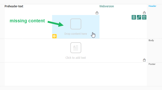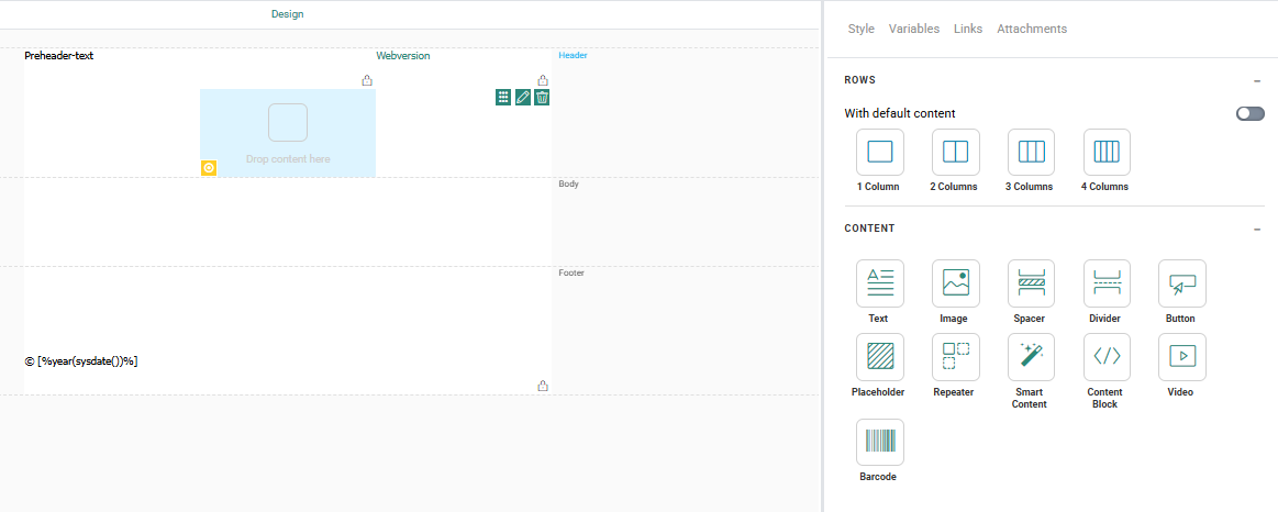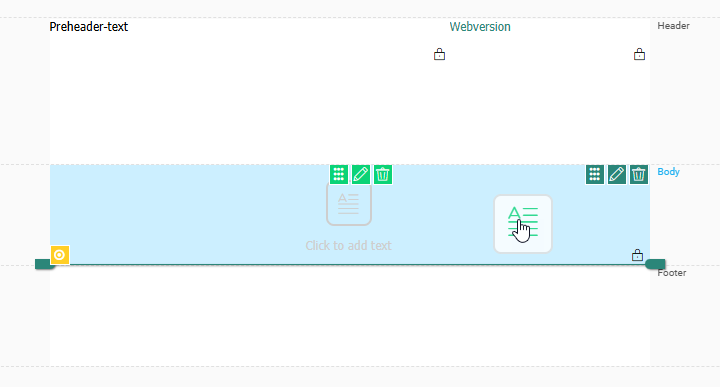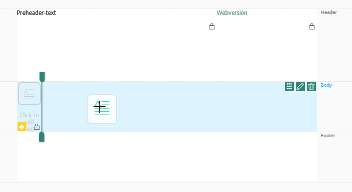Header — Displayed at the top of the message. By default, the header contains one row with two columns with text components already placed in them: a preheader text and a webversion link You can add additional elements to the header and remove the default elements if required.