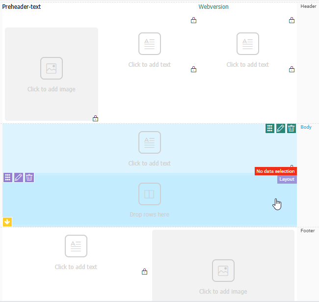 Mandatory rows must be added to the sections where it says Drop rows here on hover over, but additional rows can be added to the header and footer as well.