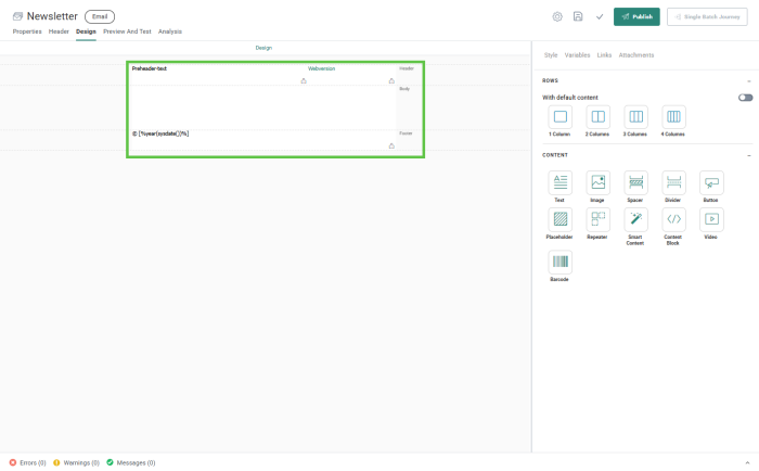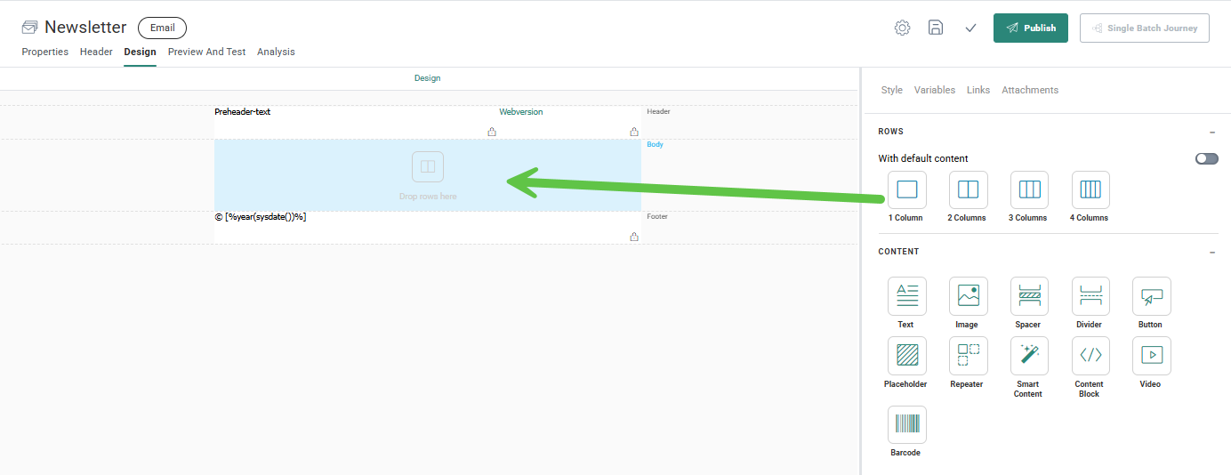 - Row components in the right panel determine the number of rows and columns in the template/email.