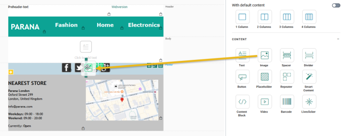 In the Responsive Design editor, a template or email is built from layout components and content components, by dragging and dropping them onto the message: