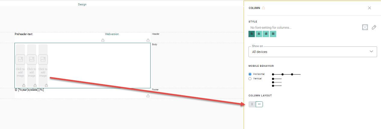 When the email is going to be displayed on a mobile device, you can choose how the column content should be displayed, horizontally or vertically.