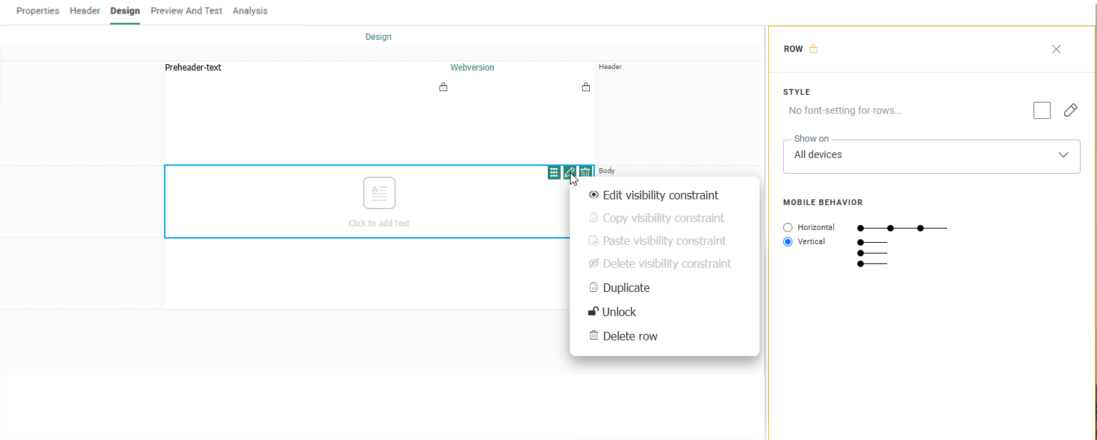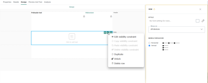 From the drop-down menu you can manage visibility constraints, duplicate the row, unlock or lock the row, define on what devices the row should be displayed or delete the row.