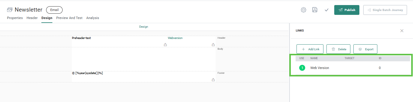 Webversion — This link is added to email messages to allow contacts to read the email message in a web browser in case they are unable to view the email correctly in their email client. When you create a new template/email, the web version link is created by default in the Links pane and placed in the header. As best practice, it's no use showing the web version link when you are already viewing the email in a web browser. A visibility constraint can be added in this case SYSTEM.MAIL=1 to show it only in the email client and not in the browser.