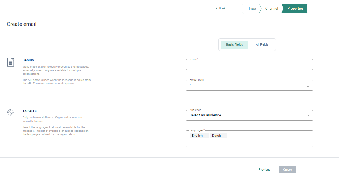 3. When a type has been selected, the Properties screen appears where you can configure the following template properties: