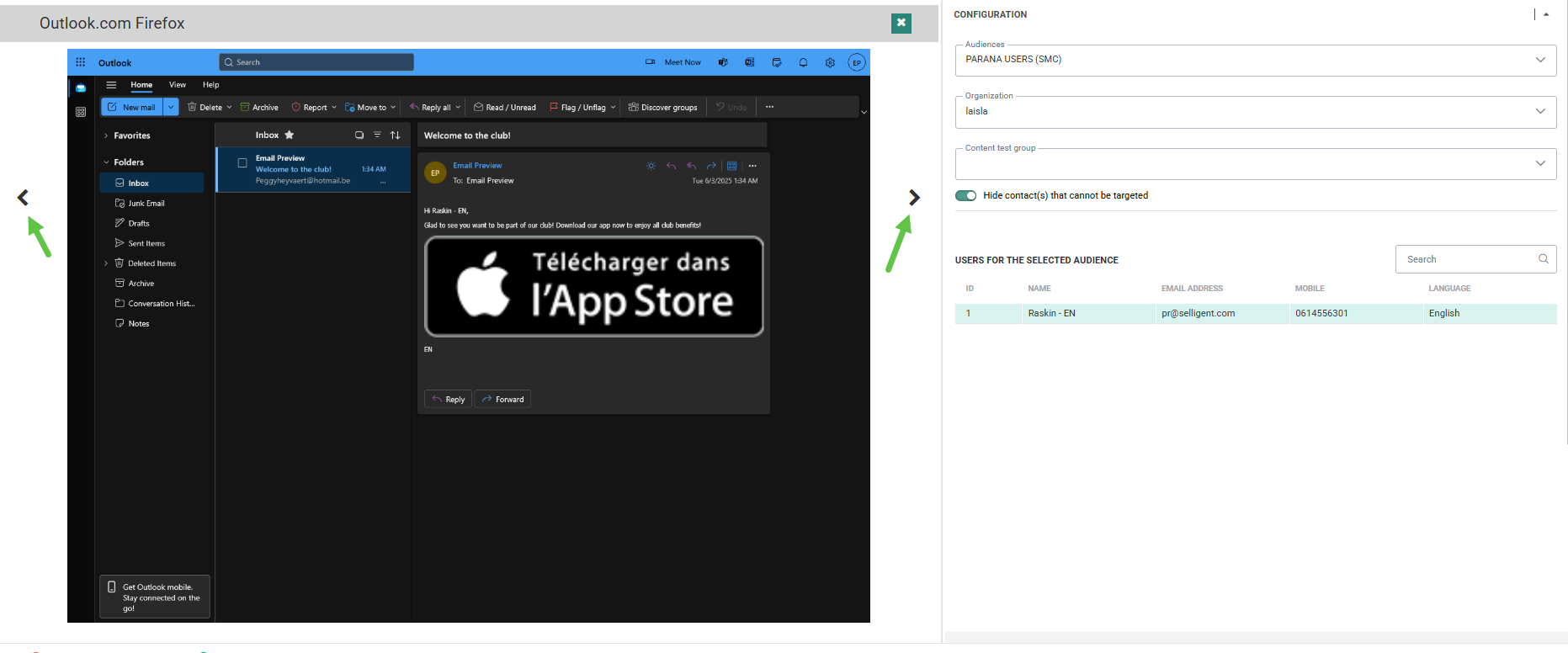 - There is a preview of the message on the different email clients. A tab is provided per type of device (application, tablet or mobile)
