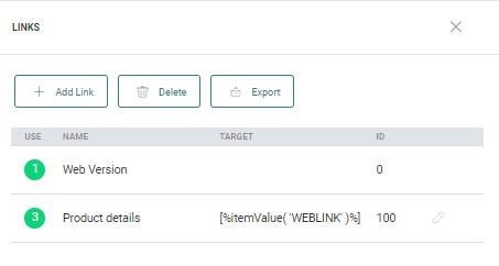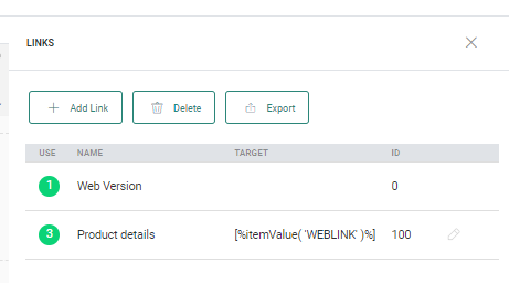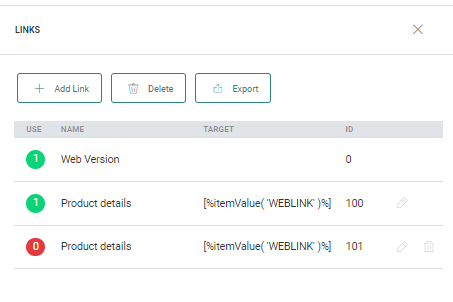 8. Click Save. The new link is added to the list. If the link has not yet been used in the message, a red icon is displayed in front. Otherwise, a green icon is displayed showing the number of times it is used.