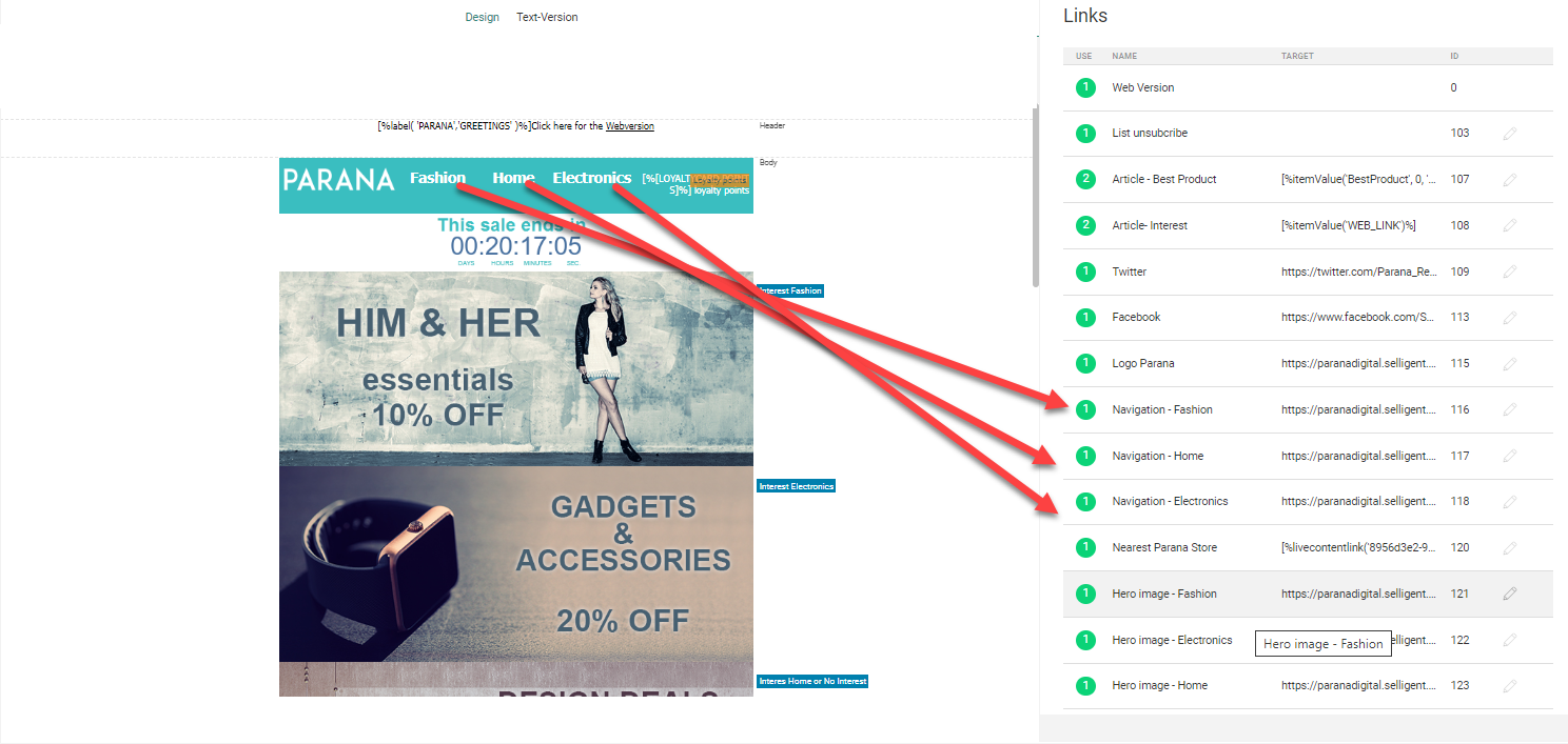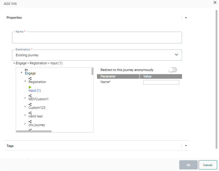 Example: If Google analytics is active on the *.com domain or *parana.com domain used in the external URL in the screen below, the value 'Newsletter' will be passed on in the URL). In case of a redirect to a journey, the entered tag value could be used when there is an analytics script running on the journey page for instance.