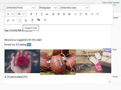 When you create a new email, the Web version link is available from the Links window even if no links have been defined yet. The Web version link is created with a constraint SYSTEM.MAIL=1 to show it only in the email client and not in the browser.