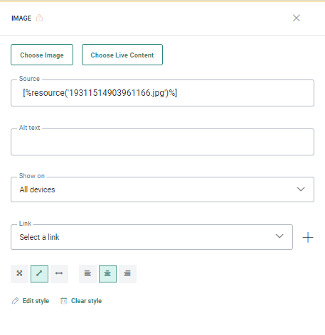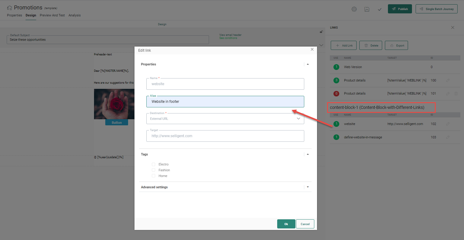 Note: In the Links panel, when editing a link in a Content Block, there is an additional option to define an alias for this link. This option is only available for this specific type of link.
