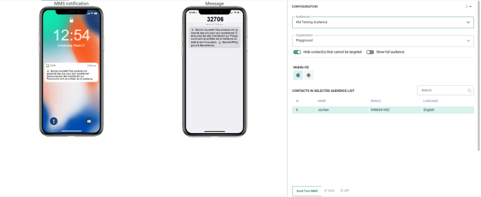 SMS/MMS/RCS messages can be sent to users in the test audience. The field that is currently used to send the SMS/MMS/RCS to is the MOBILE field in an Audience List.