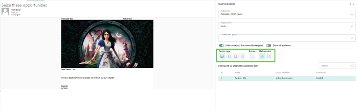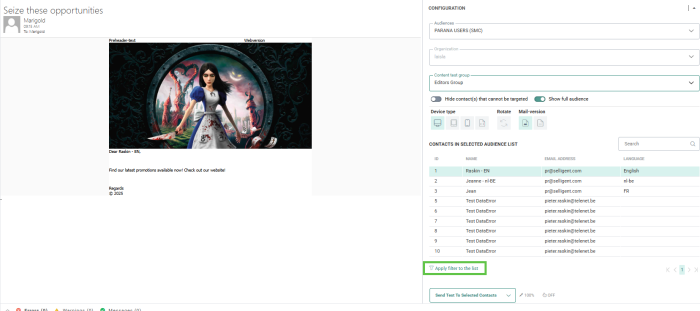 An audience and testuser can be selected. Only contacts set as TESTUSER in the audience will be displayed here. The personalization fields and content sections are adapted to the selected contact.