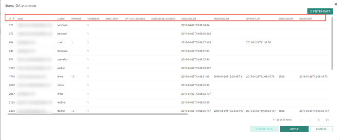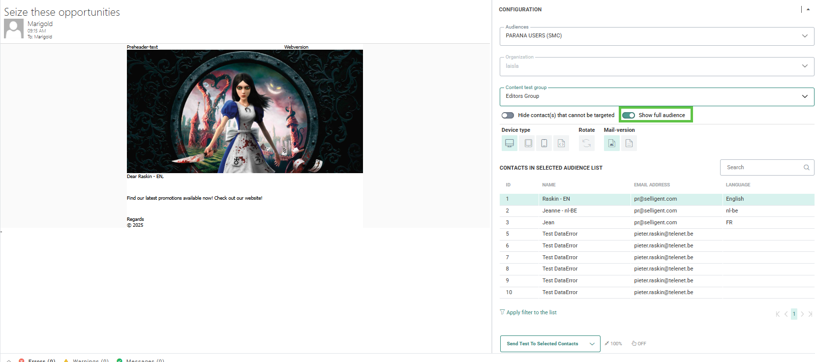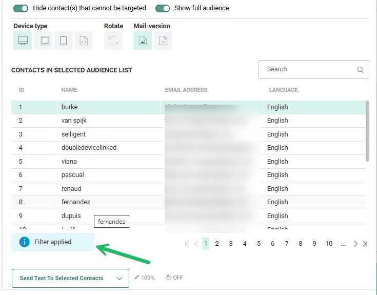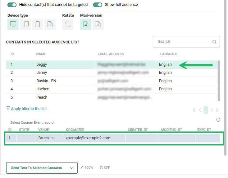 By default, the overview only displays test contacts from the Audience List, or when selected, for the Test Group. Toggle the option Show full audience on to also display the real contact records in the audience or Test Group. A maximum of 1000 contact records are loaded.