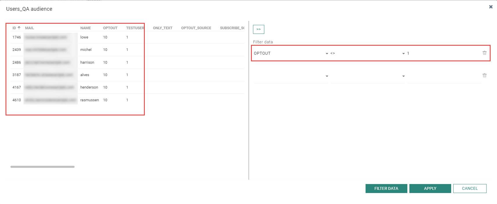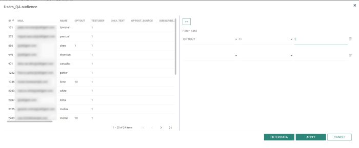 Click the button Filter data in the lower right corner to filter the data and only return the contacts that comply with the entered filter.