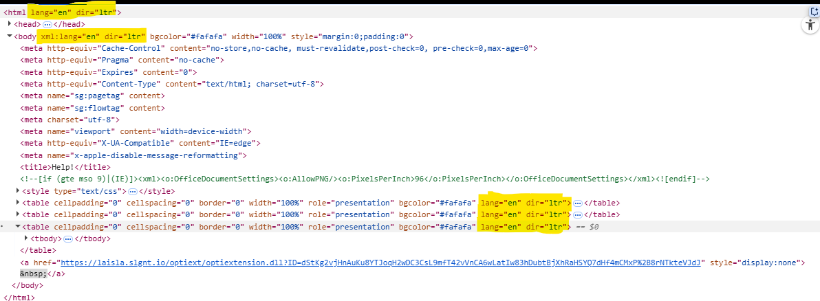 Note 2: Upon Publish, a language and dir attribute is automatically added to an HTML tag in your messages as well as to the body, based on the language of the message. The dir attribute indicates the direction in which the text needs to be read, ltr or rtl. This is important because these language tags are used by browser AI translations. ![]()