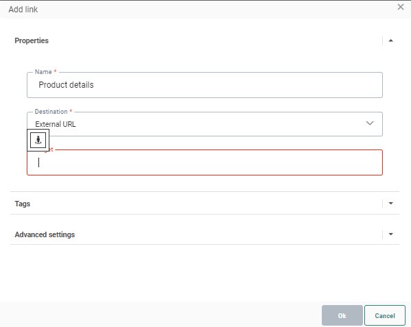 The Add link dialog is displayed. In the Target field, select the personalization icon to access the Personalization dialog and select the field that holds the URL of the product. The following value is returned to the Target field