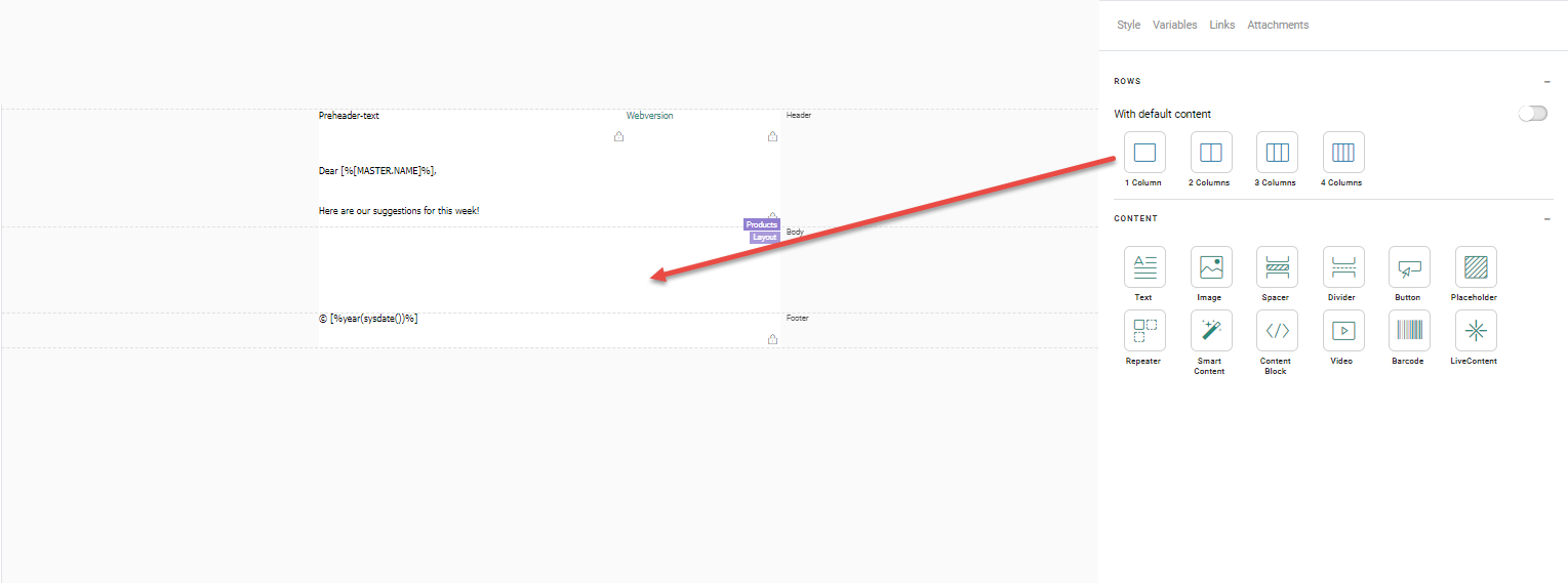 The first step is to add the rows, with or without content. You can add rows with up to four columns, meaning a maximum of 4 items can be displayed next to each other.