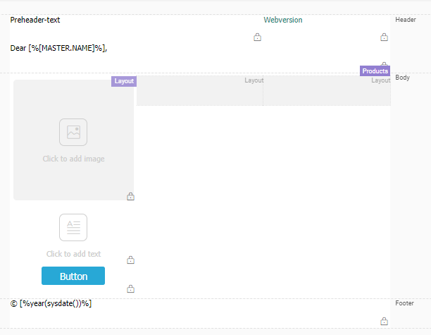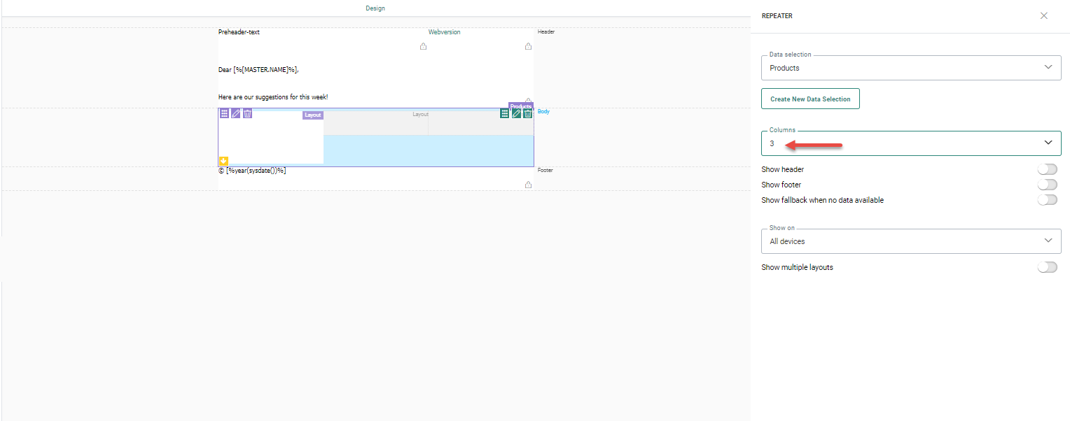When a repeater is added to the design, it has a predefined layout with Header, Layout, Footer and No match section. Only the layout section is mandatory and is visible by default. The other sections are optional and can be hidden.