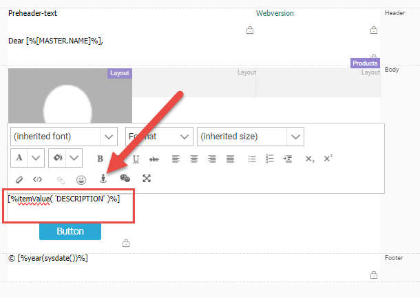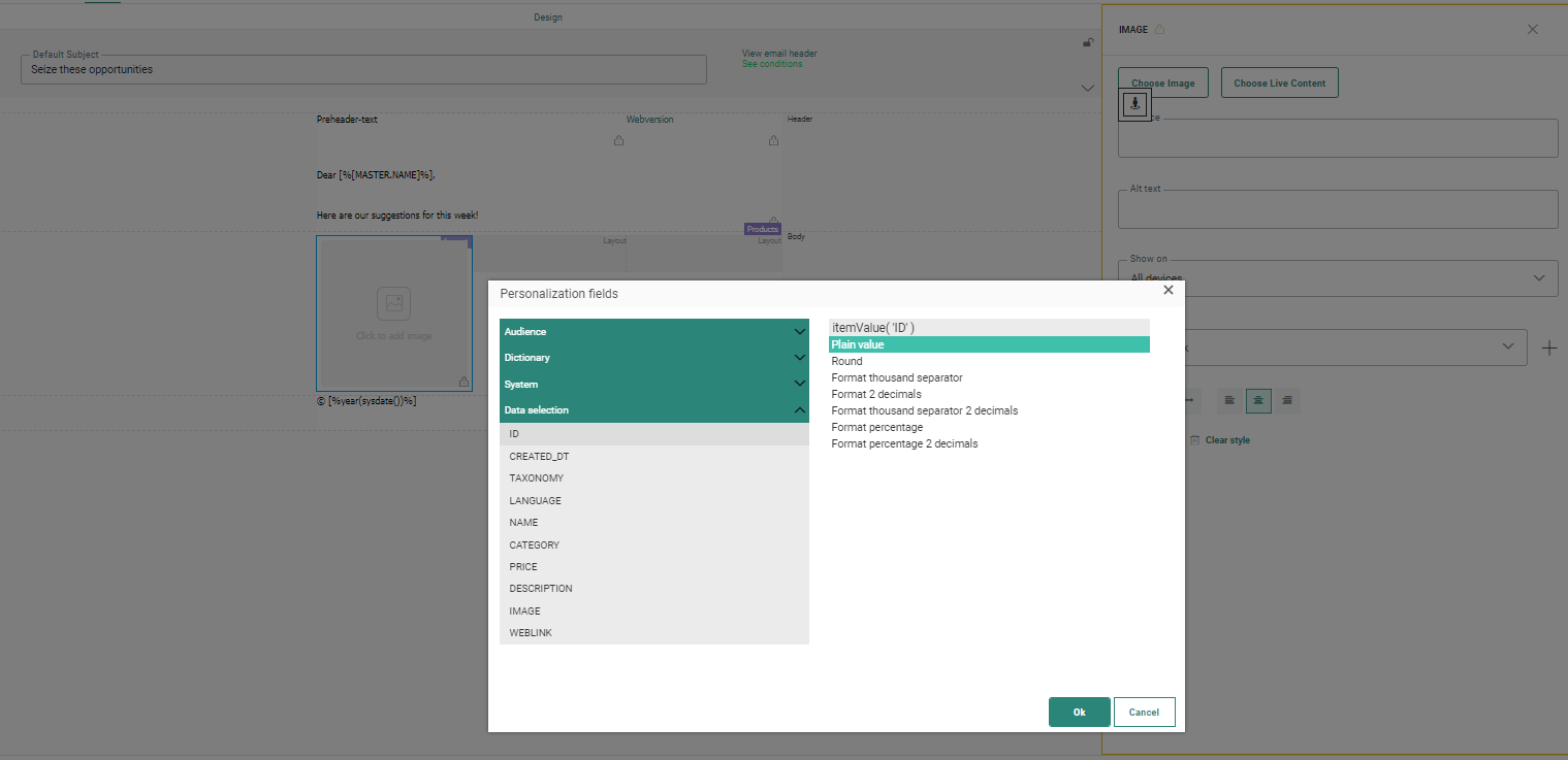 The last step is to indicate what should be used as content source for each of these content components. Because we display information coming from the data selection defined for this repeater, we will have to use personalization fields from the data selection.