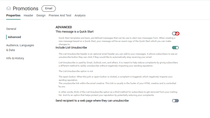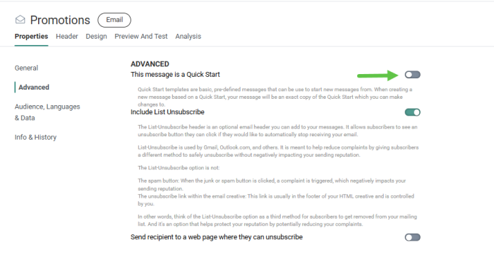 2. In the Advanced section, a toggle is available to mark the message as a Quick Start.