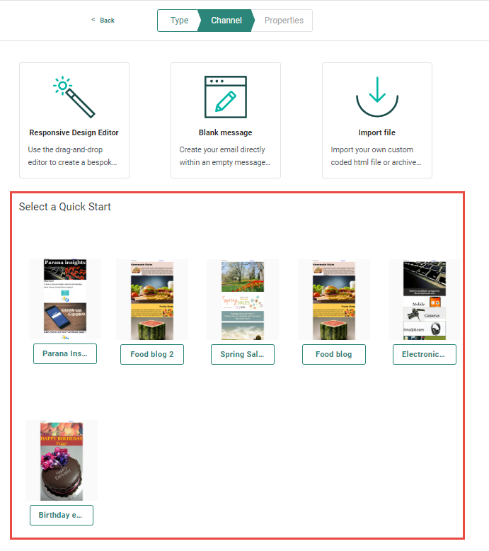 Quick Starts are created from an existing email or page and are used as a quick way to create future communications. They speed up the creation process of similar communications, while leaving total freedom to marketers to apply any changes required. Following applies: