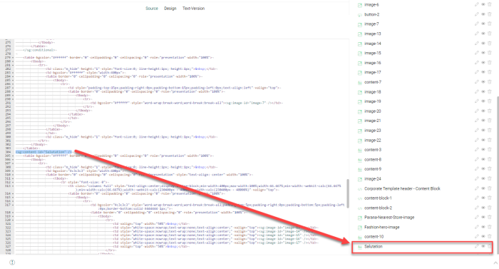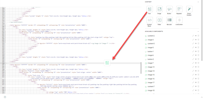 In Source mode, content creators can create messages entirely from scratch in HTML or modify an imported HTML file directly in the code. In addition, the Source mode editor also allows users to drag-and-drop Selligent content components into the source code: