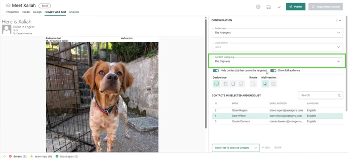 Contacts in the selected Content Test Group are now listed. By default, only contacts marked as test-user are shown. To list ALL the contacts, activate the option Show full audience.