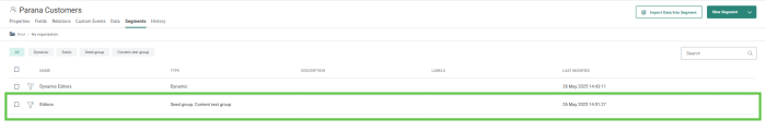 5. The segment is now listed in the Segments tab of the Audience List. Depending on the options selected for the Test Group, it will be listed with type 'Seed group, Content Test Group'. Use the filter buttons at the top to filter out the Test Groups or Seed Groups.